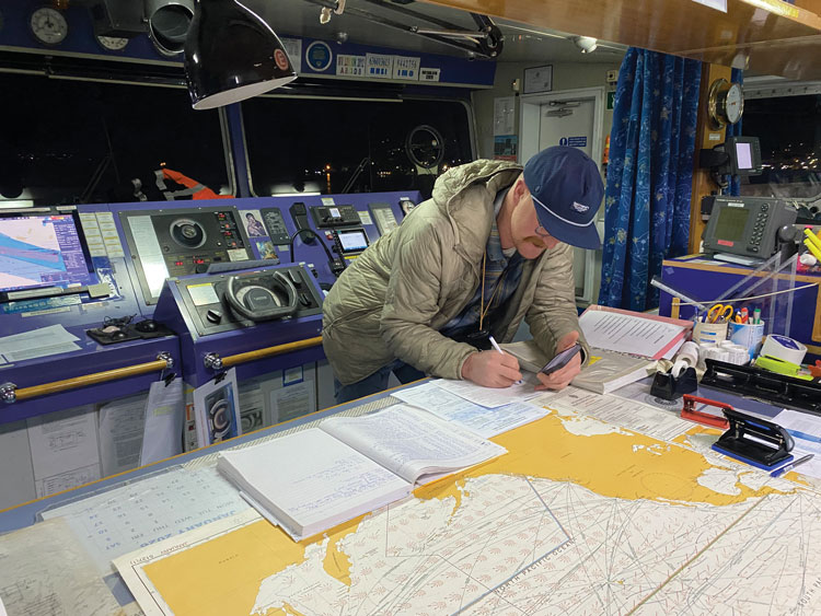 Cedric Barrett is converting to kilometers. He’s leaning on a countertop over a map of the Pacific Ocean, filling a worksheet with calculations in pencil. He smiles wryly. “Gotta convert to metric,” he says. Barrett is getting ready for a transit aboard a ship from the Philippines; the hatches have been loaded up and they are ready to go out to sea. The bridge is filled with constant beeps and boops. A bank of screens, visually not unlike a NASA mission control center, stretches the length of the room. One shows radar, the line circling the screen over and over, revealing green blotches like lichen on a log. Phones ring—the kind of off-white receiver with a curly cord that disappeared shoreside in the early aughts. A similarly anachronous printer makes a screech and spits out a weather report from Hawaii on paper with perforated edges.